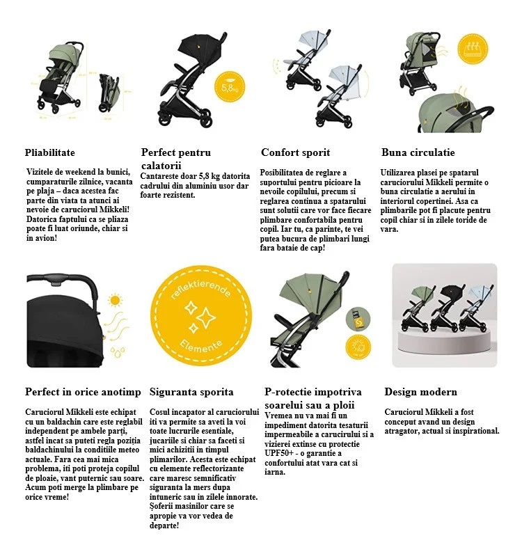 Carucior sport pliabil ultracompact pentru calatorii Mikkeli este perfect pentru plimbari fiind pregatit sa descopere lumea alaturi de copilul tau!