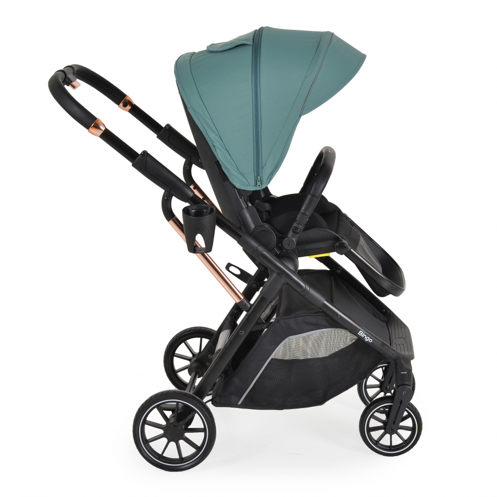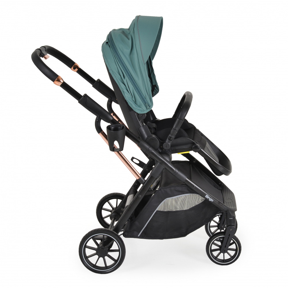 Carucior transformabil 2in1 Moni Bingo Marine Green cu sezut reversibil,pana la 4 ani sau 22kg,spatar reglabil,capotina XXL cu 4 sectiuni,pliere compacta cu unitatea scaunului, roti rezistente,husa picioare si geanta