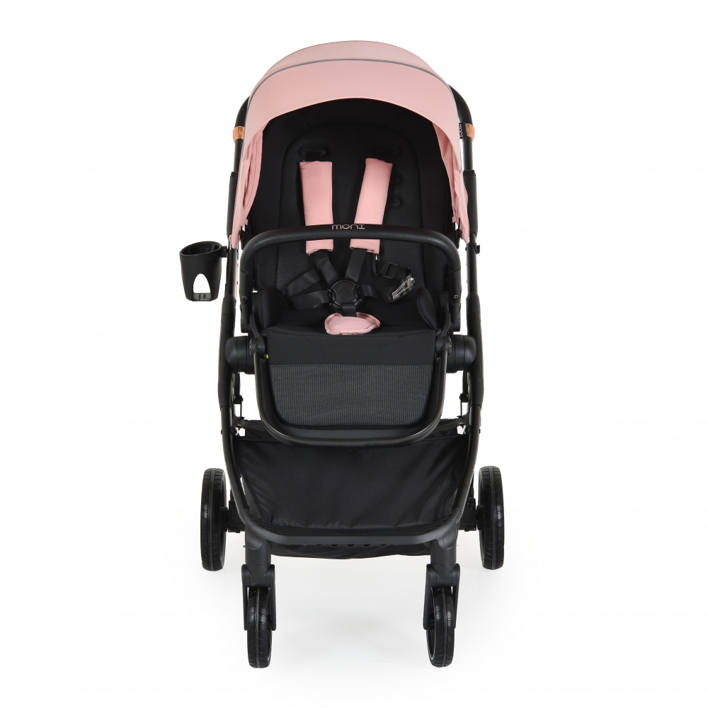Carucior transformabil 2in1 Moni Bingo Pink-icing cu sezut reversibil,pana la 4 ani sau 22kg,spatar reglabil,capotina XXL cu 4 sectiuni,pliere compacta cu unitatea scaunului,roti rezistente,husa picioare si geanta incluse