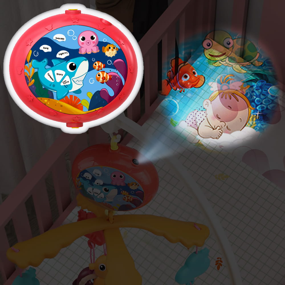 -In plus, caruselul are un mini proiector cu un copil care doarme si animale marine activate de o telecomanda