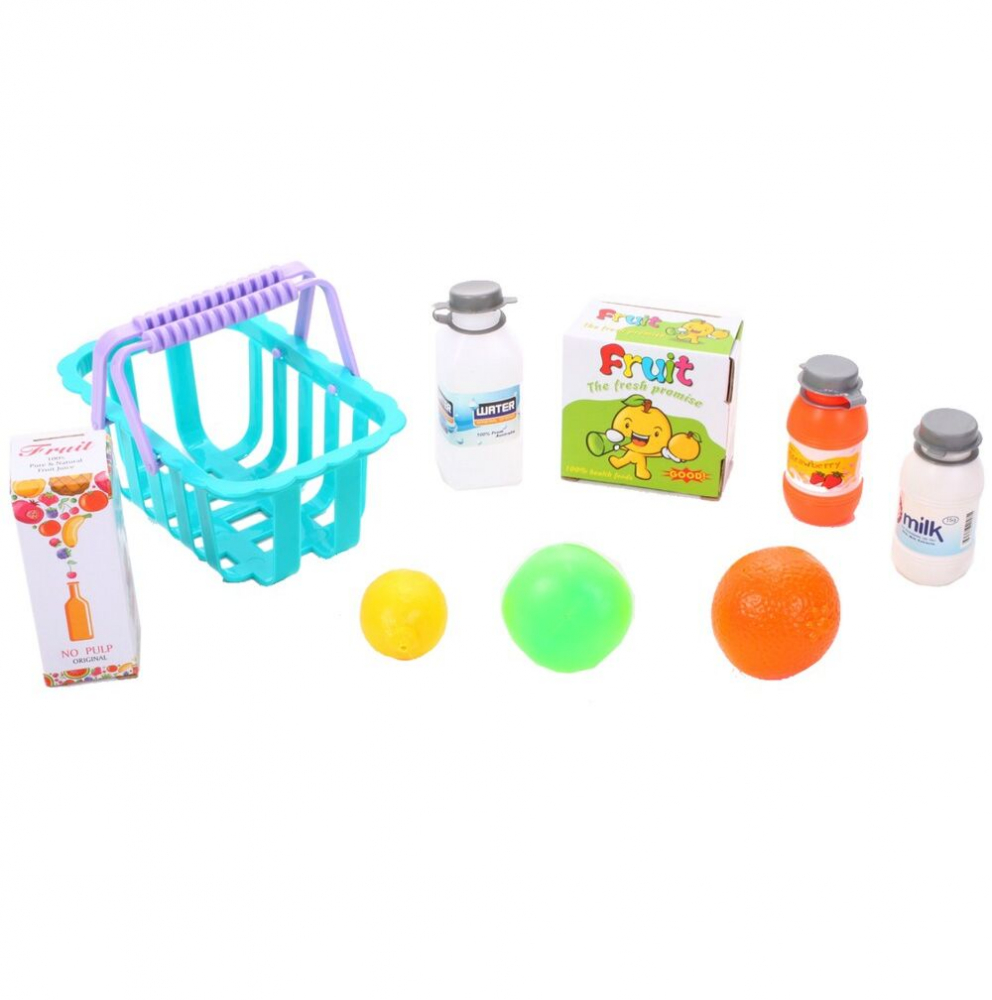 Produse alimentare incluse : lamaie, portocala, pere, suc, sticla de apa, lapte, cutie.