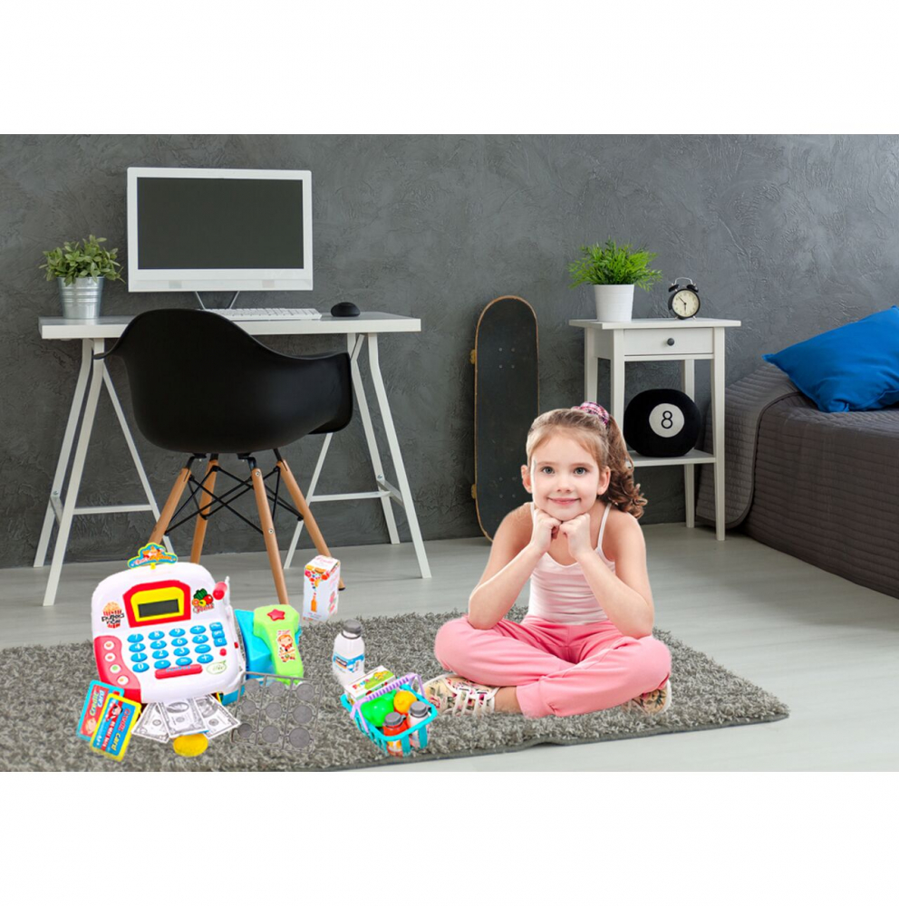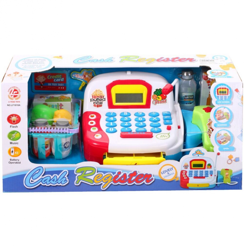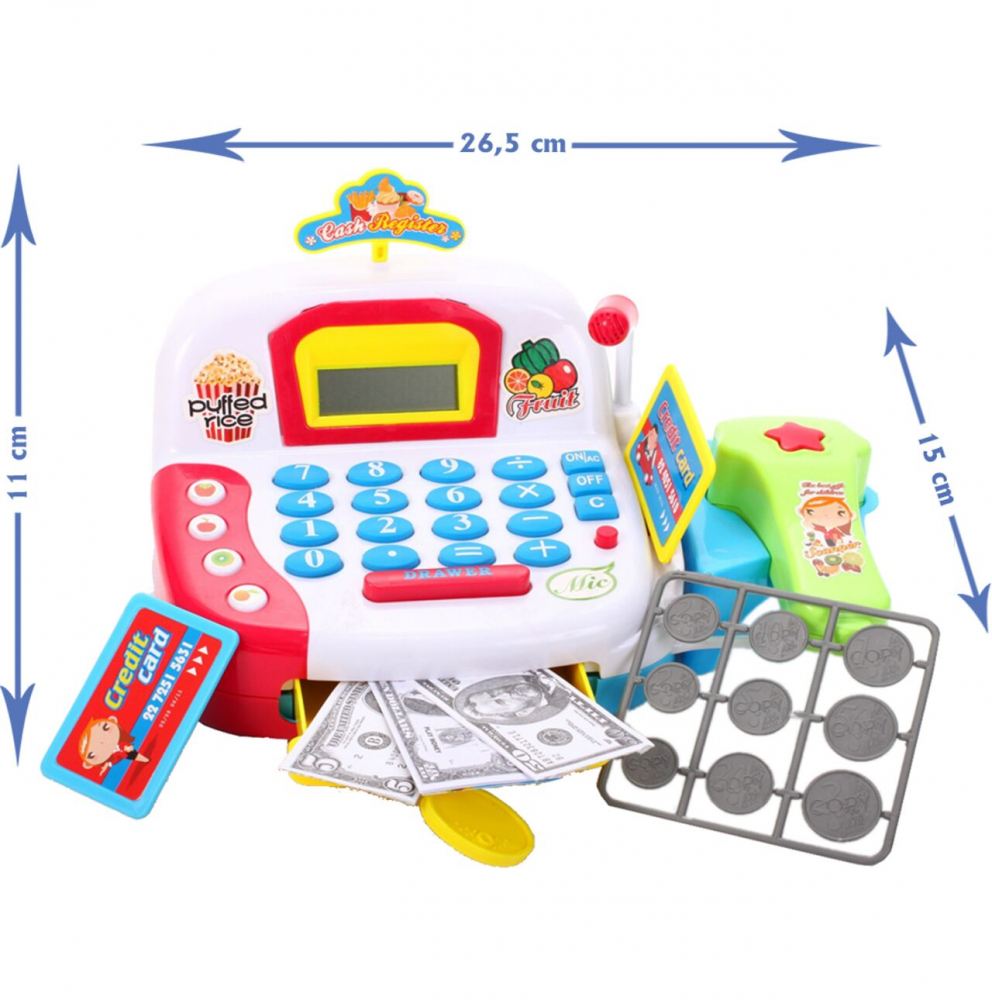 Casa de marcat cu butoane sonore, Scanner, Sertar automat cu cheie, cash, si Cosulet echipat cu alimente, 11 x 15 x 26.5 cm