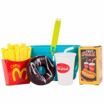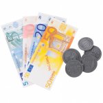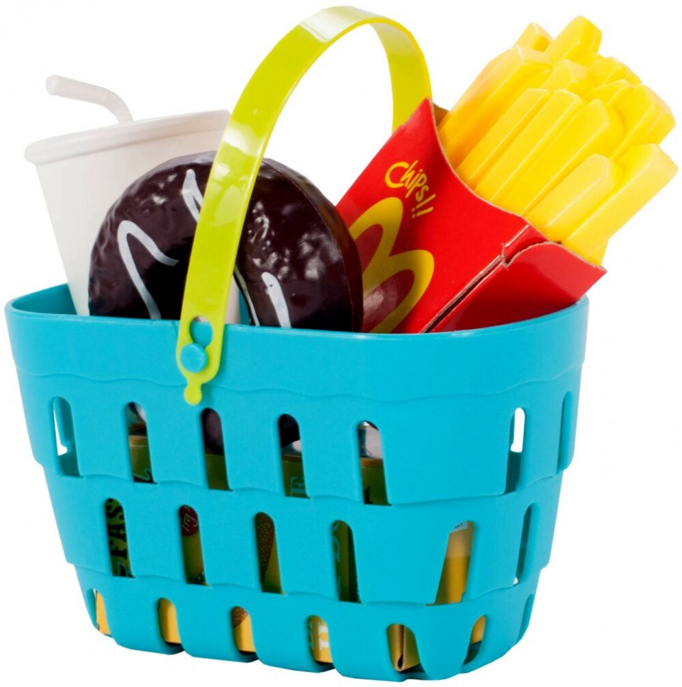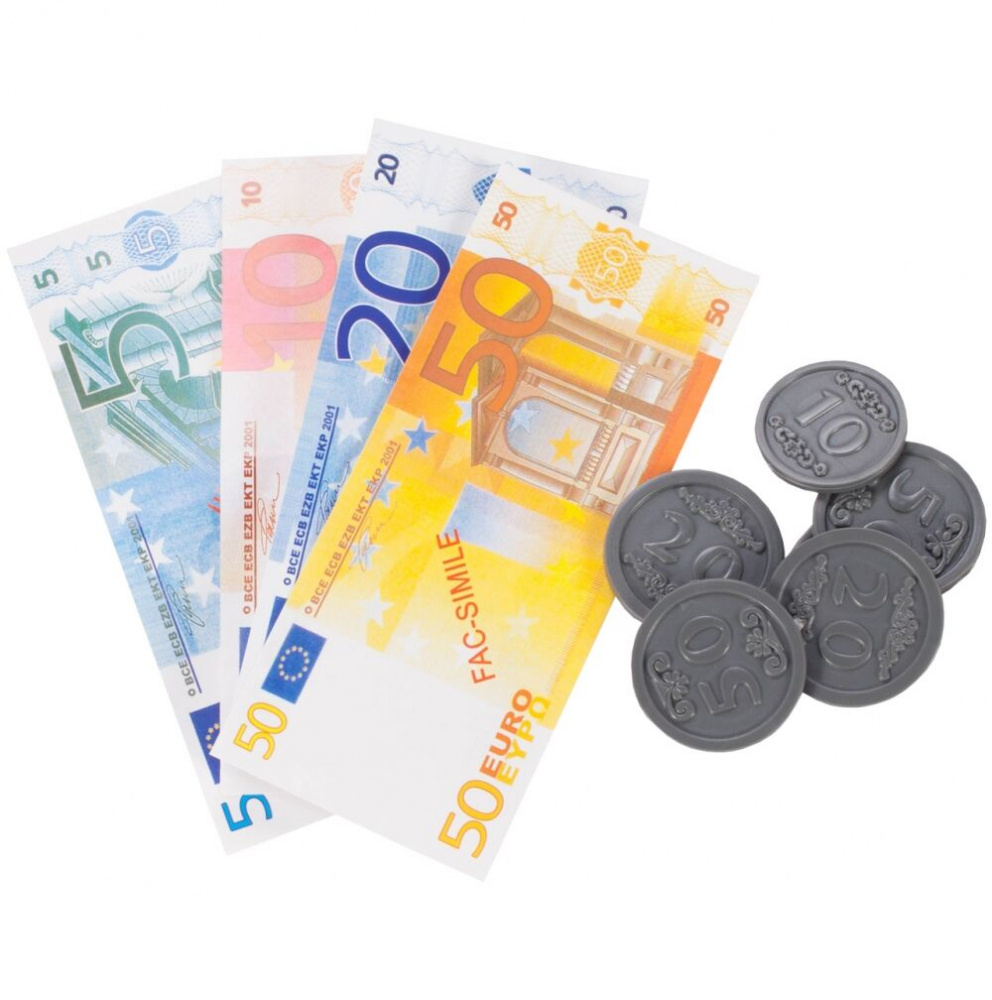 Setul include si un cos, produse, un card de credit, monede de plastic si bancnote de diferite valori.