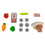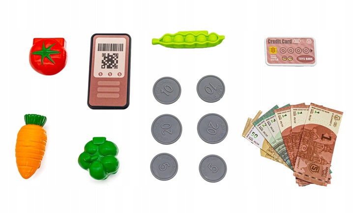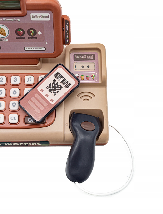 Setul are, de asemenea, si un cititor de coduri asemenea unui magazin real; Daca scanati mai multe produse - calculatorul va rezuma automat suma comenzii. Pentru a inchide contul, apasati butonul ''=''.
