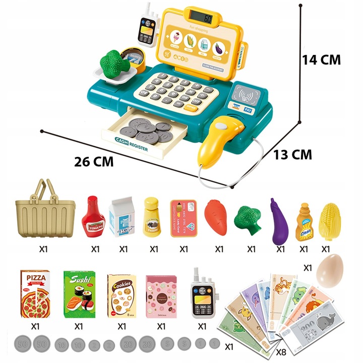 - Setul include, de asemenea, un cos de cumparaturi si o varietate de produse alimentare care pot fi "vandute" si "cumparate".