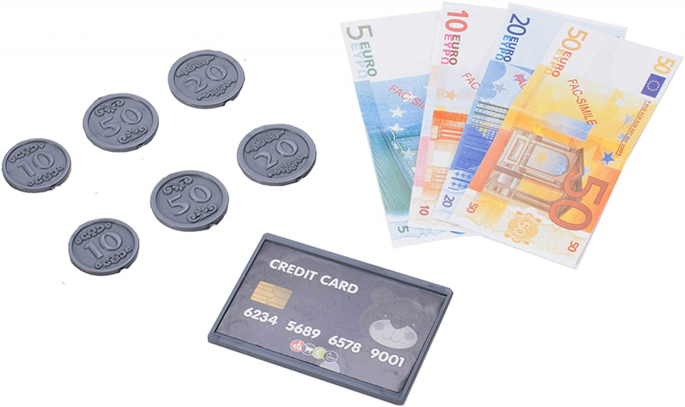 * Setul mai include 2 sticle, 4 pachete de carton, un cos de cumparaturi, un card de credit, monede de plastic si bancnote.