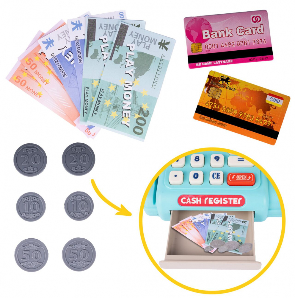Setul include bancnote de jucarie, monede si un card de plata , ceea ce permite o simulare completa a cumparaturilor