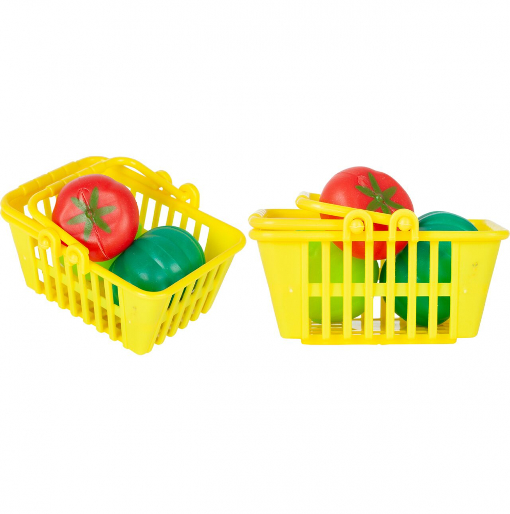Produse de jucarie, printre care 3 legume (rosii, salata verde, dovleac) si o cutie de fursecuri, toate usoare si realizate din plastic de calitate, non-toxic.