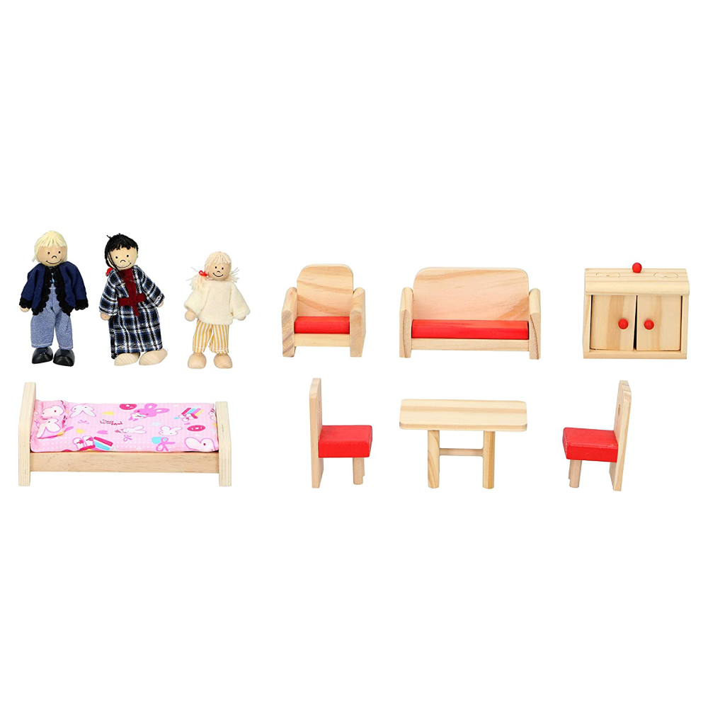 Set extins de accesorii: 3 figurine (barbat, femeie, copil), 2 scaune, 1 masa, 1 pat, 1 dulap, 1 fotoliu si 1 canapea.