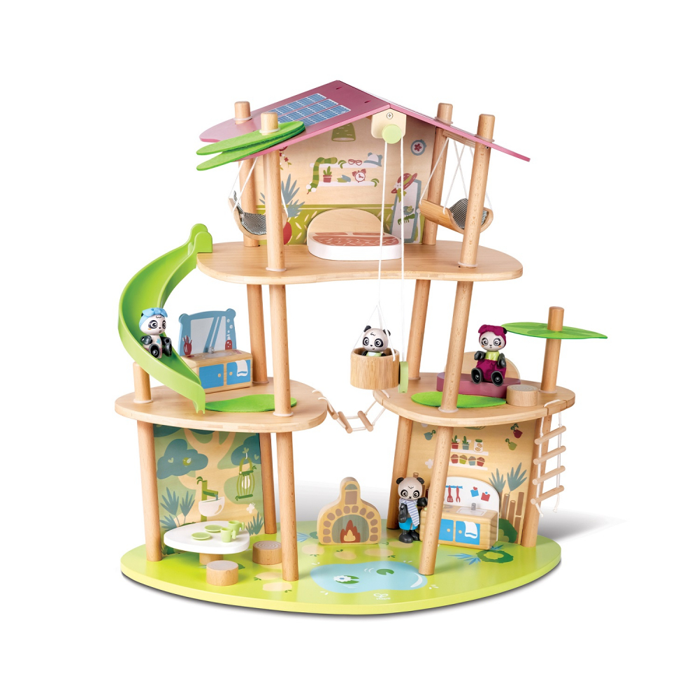 Jucarie din bambus - Casa ursilor Panda (25 piese) - Set de joaca pentru papusi din bambus pe 3 niveluri pentru copii mici si prescolari!