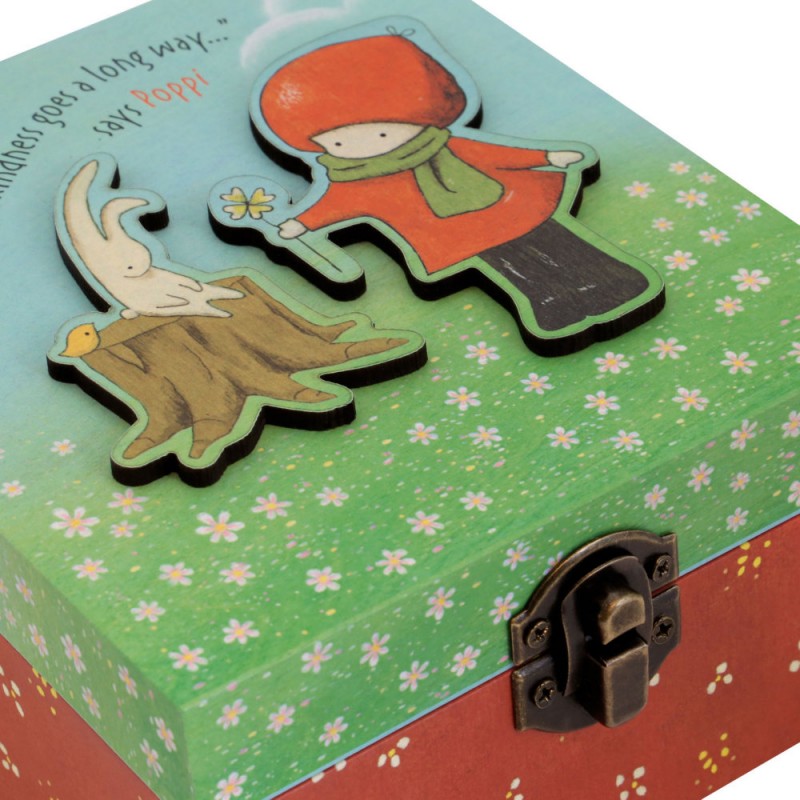 Cu un design deosebit si o cromatica speciala, aceasta caseta bijuterii include pe capac si un frumos mesaj „Este nevoie de un drum lung pentru un mic act de bunatate”. Asta spune Poppi in timp ce ii ofera o floare prietenului sau White Bunny. Pe langa acest superb decor, capacul cutiutei are si o coloristica speciala, cu verde smarald, albastru deschis si rosu, in partea de jos fiind desenat si un camp de margarete.