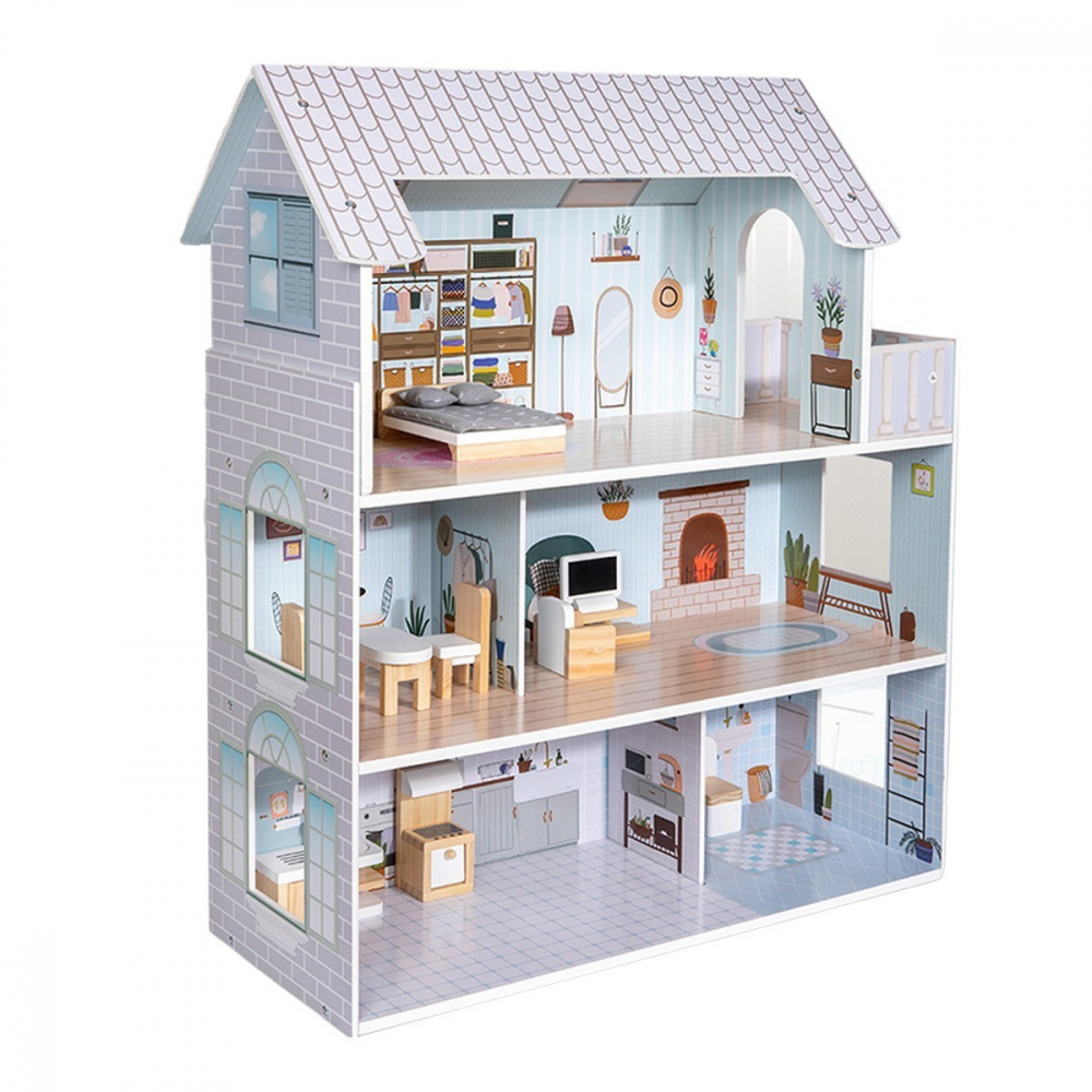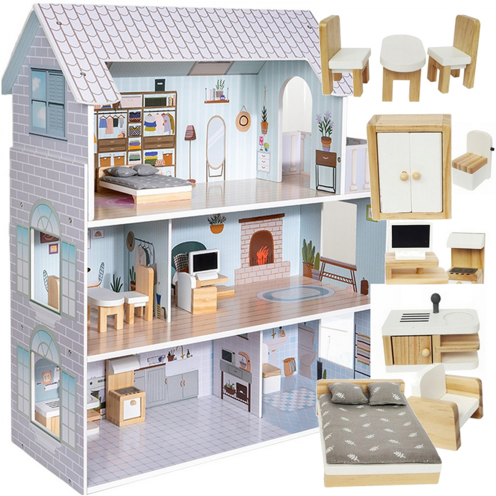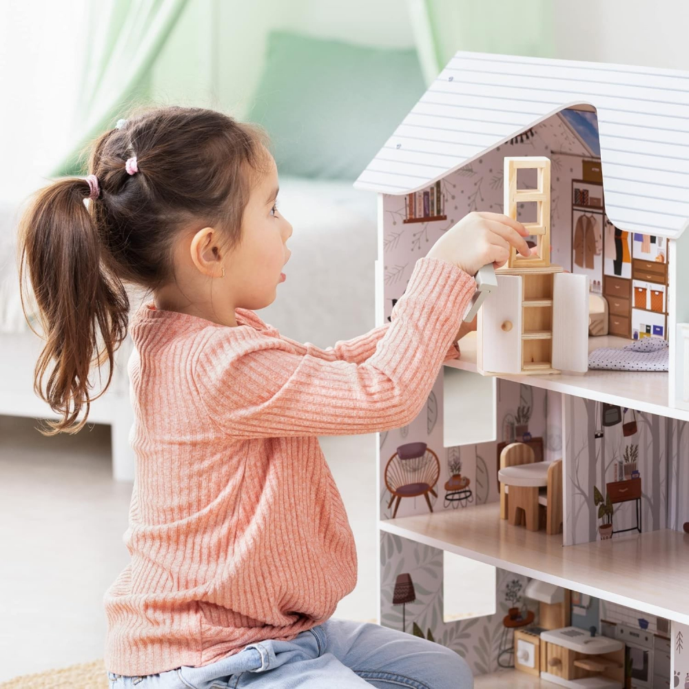 Casuta de papusi din lemn cu 3 etaje si mobilier inclus Boho XXL 70 cm