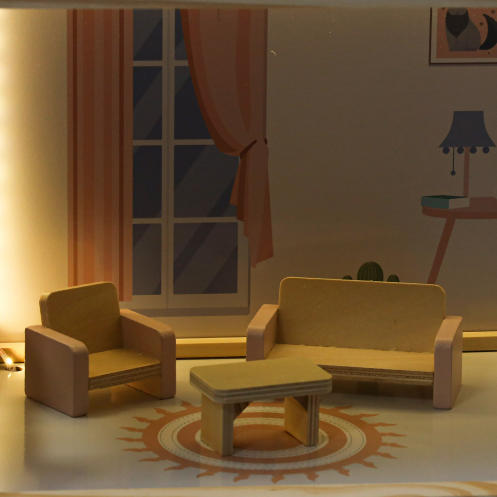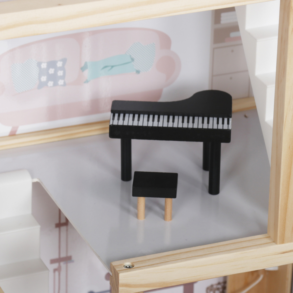 Materiale Sigure si Durabile: Construita din lemn si MDF, casa este solida si rezistenta. Toate elementele sunt slefuite cu grija pentru a preveni aschiile, asigurand o joaca sigura si de lunga durata.