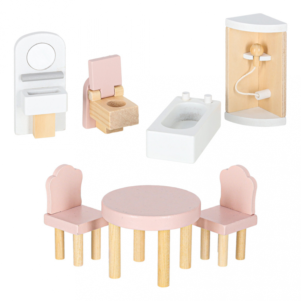 Set Bogat de Mobilier: Vine complet echipata cu un set de mobilier din lemn in miniatura, permitand aranjarea si rearanjarea incaperilor (Imaginile prezinta diversele piese de mobilier incluse, de la paturi si mese la accesorii de baie).