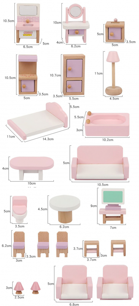 Bucătăria din set va permite micilor bucătari să pregătească mese delicioase pentru păpuși, iar lampa și patul din dormitor vor adăuga confort interiorului. De asemenea, merită să adăugați în casă o cadă, o masă, o canapea, o toaletă, o masă cu televizor și diverse tipuri de scaune, precum scaune, taburete și chiar fotolii. Toate acestea vor face ca fiecare prințesă să-și creeze locul de joacă de vis.