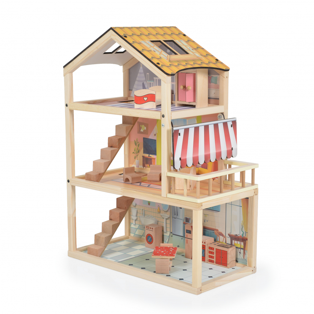 Casuta din lemn Moni pentru papusi cu 13 piese mobilier Nina