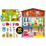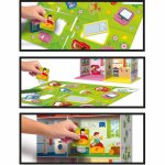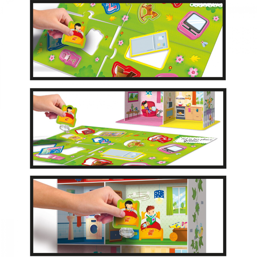 - pentru a ghida copilul in joc, fiecare element are o culoare de fundal care corespunde cu una dintre culorile camerelor; astfel incat cada are un fundal albastru la fel ca podeaua din baie, patul are un fundal verde la fel ca podeaua pe care ar trebui asezat si asa mai departe