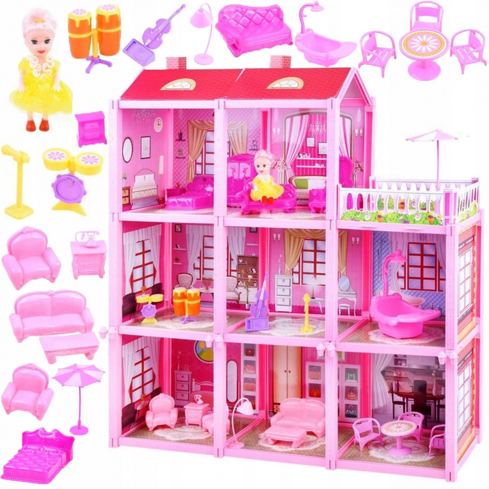 Casuta pentru papusi Matadi Fashion Villa Pink cu 3 etaje,8 camere si terasa, mobilier si papusa incluse