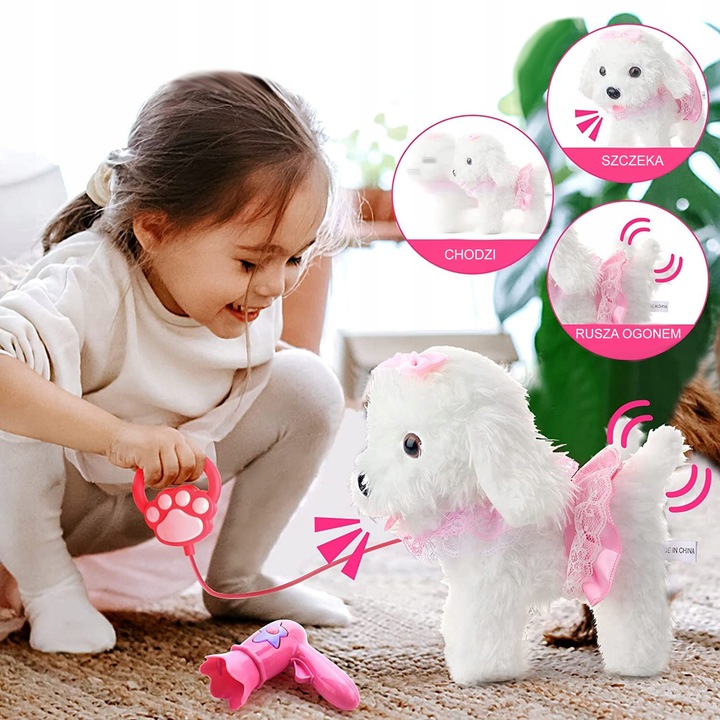 Catelusul interactiv poate merge singurel si, de asemenea, latra ca un catelus adevarat si da din coada fericit.