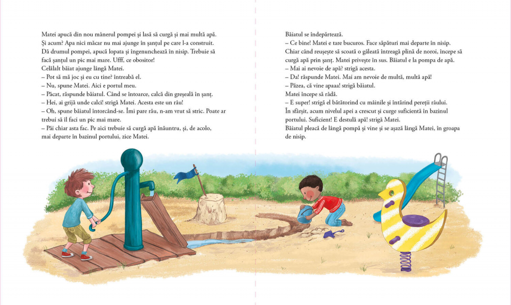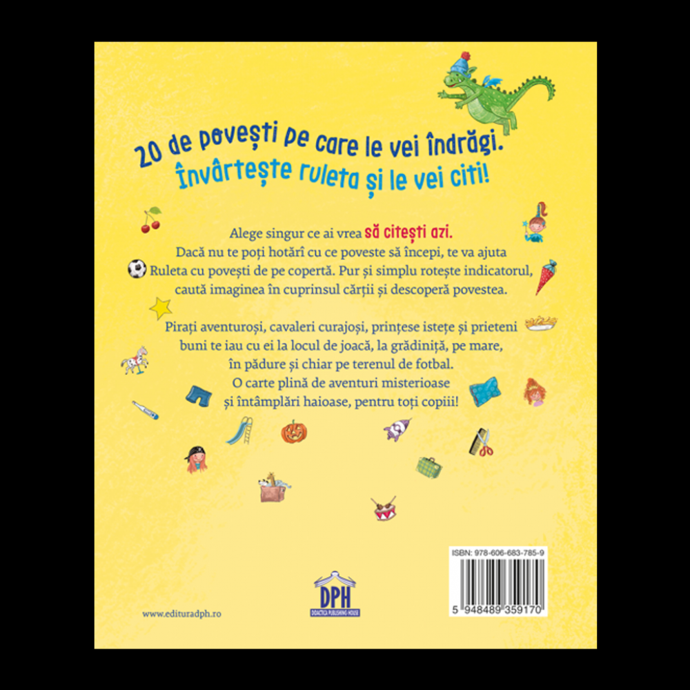 Această carte de lectură captează imediat atenția: copiii folosesc Ruleta cu Povești de pe copertă și este deja clar ce se va citi. Pur și simplu, trebuie să rotească indicatorul, să caute imaginea în cuprinsul cărții și să descopere povestea. Chiar și cei mici vor găsi rapid imaginile simple din cuprins. Cele 20 de povești de diferite lungimi se învârt în jurul subiectelor preferate: pirați aventuroși, cavaleri curajoși, prințese istețe și prieteni buni, care vă invită la locul de joacă, la grădiniță, pe mare, în pădure și chiar pe terenul de fotbal.
