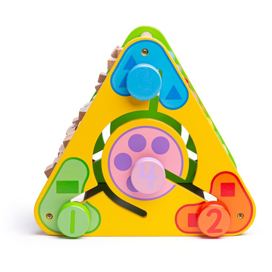 Acest centru de activitati triunghiular are 5 parti: pe una dintre parti este alfabetul format din cuburi multicolore, pe alta parte o tabla de scris, pe cea de-a treia o numaratoare.