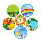 - 5 discuri din material textil, reprezentand cele 4 anotimpuri si 1 curcubeu. Fiecare disc este caracterizat de de un stimul special care ajuta micutul sa-si dezvolte abilitatile specifice.