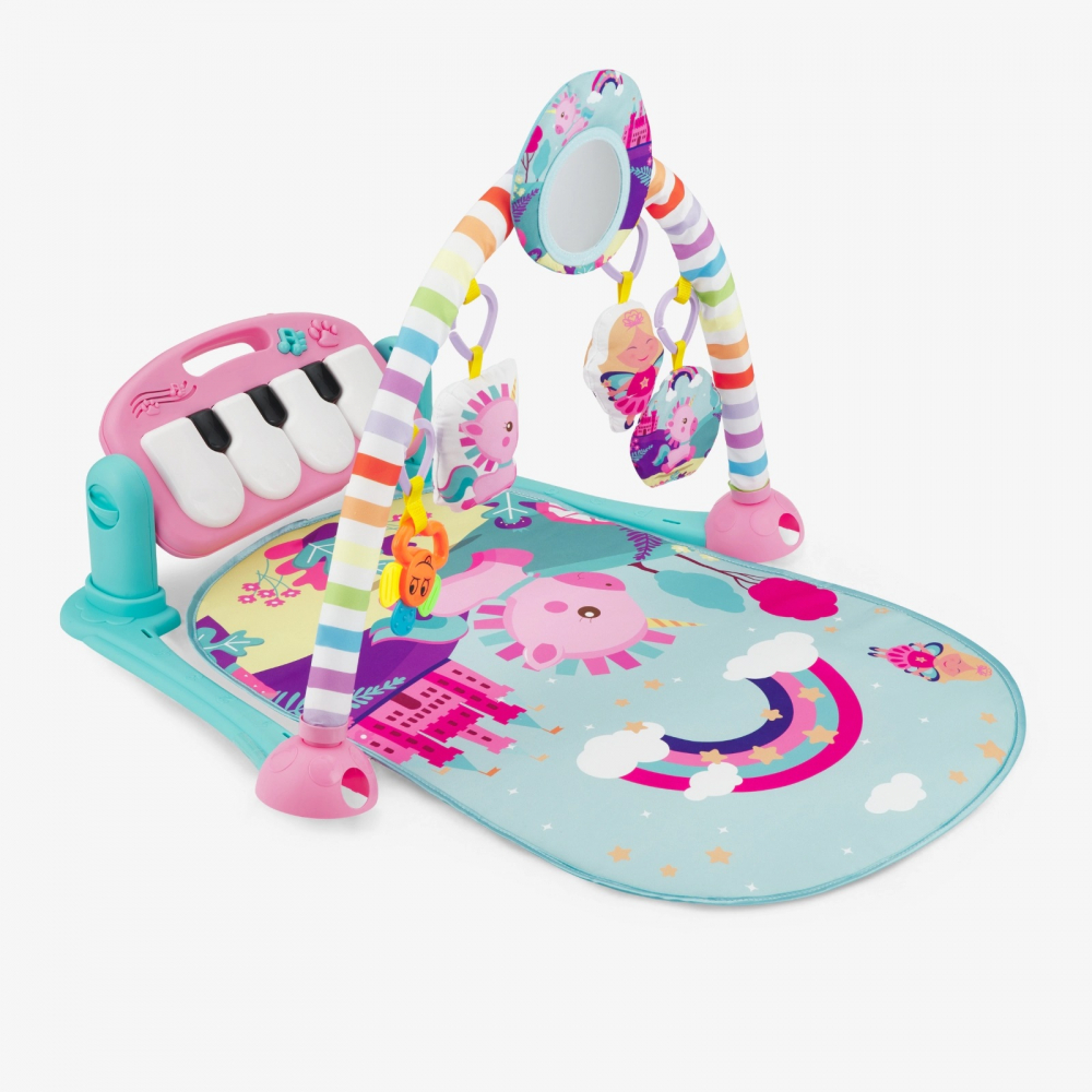 Confectionata dintr-un material moale, frumos colorat, covorasul de joaca intruneste mai multe trasaturi care ajuta copilul sa-si dezvolte simtul de coordonare mana-ochi si capacitatea de a urmari obiectele cu privirea.