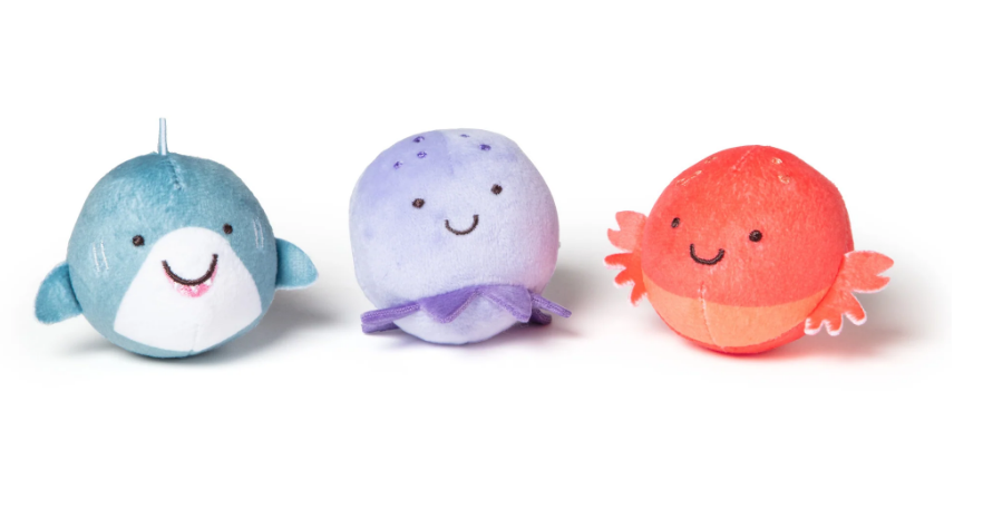 Cele 3 jucarii rotunde vin in forma de: rechin, crab si caracatita cu clopotel. Ele sunt usor de apucat pentru sugari si copii mici, fiind suficient de ferme pentru a se rostogoli si suficient de moale pentru a fi stranse.