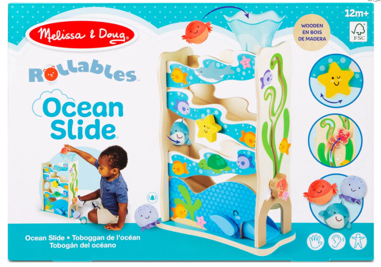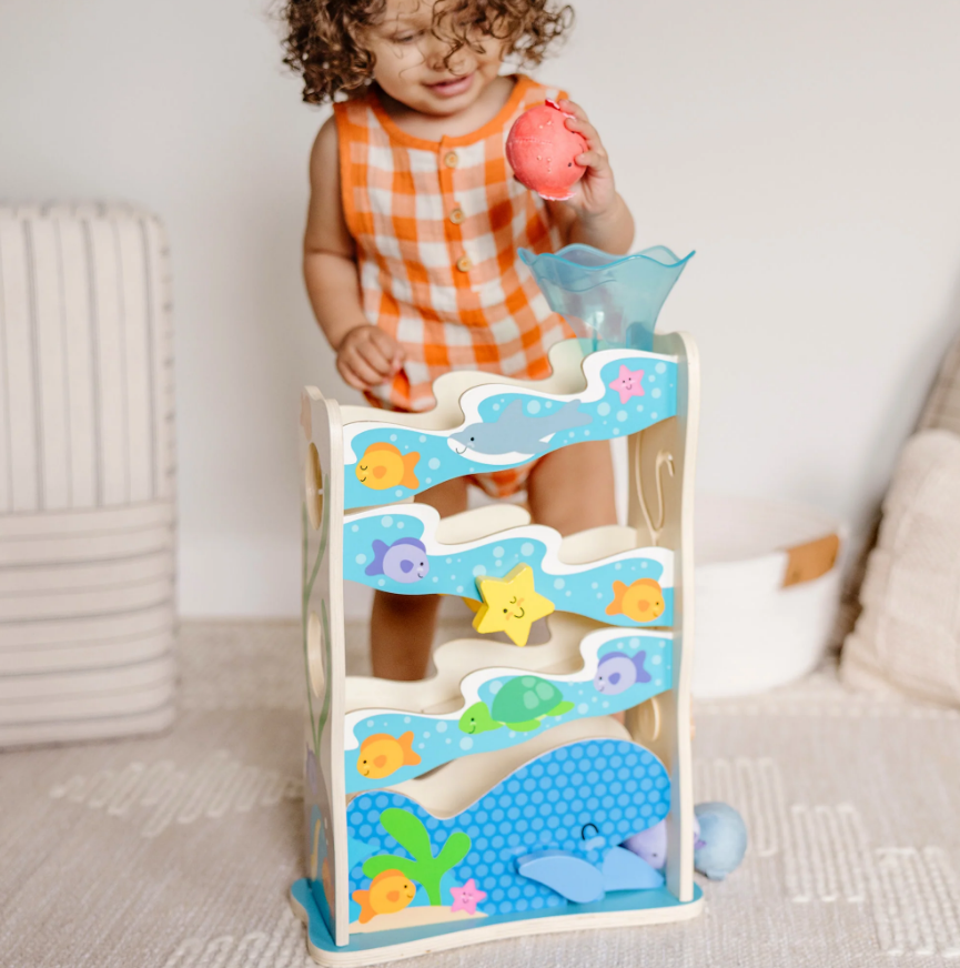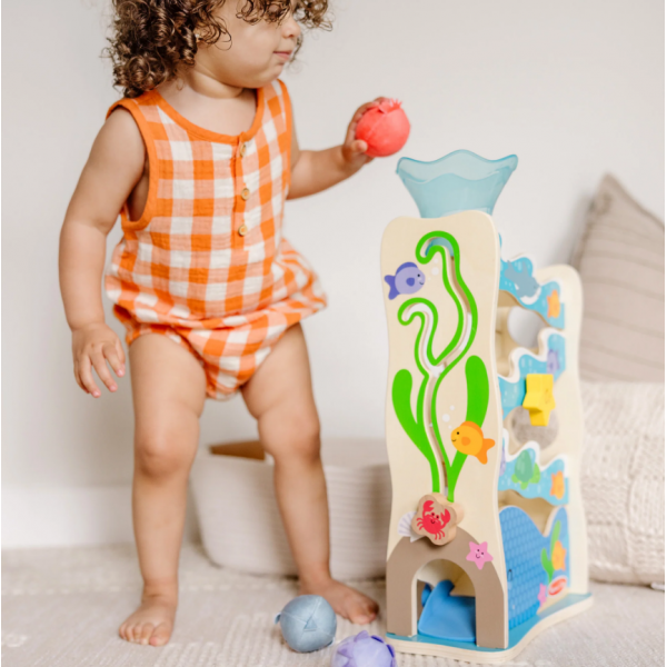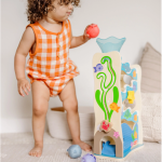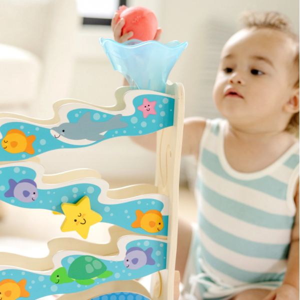 Inspira aventuri imaginative pe malul oceanului prin joc cinetic cu un tobogan din lemn si 3 jucarii adorabil de rotunde.