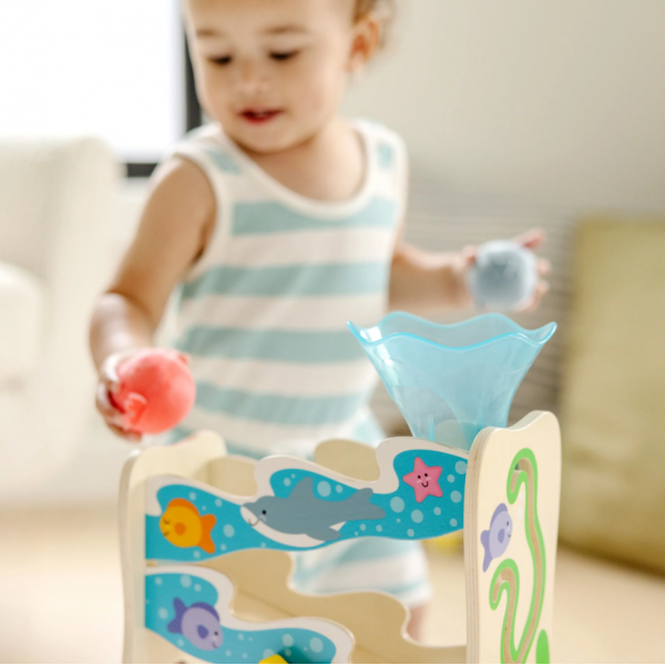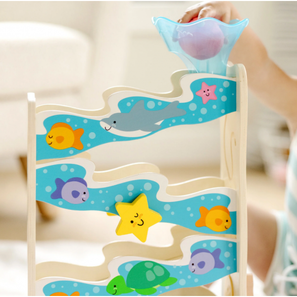 Include turn de tobogan cu labirint incorporat, o stea de mare ce poate fi invartita, o balena cu gura miscatoare ce poate oprii cele 3 jucarii rotunde si o palnie detasabila.