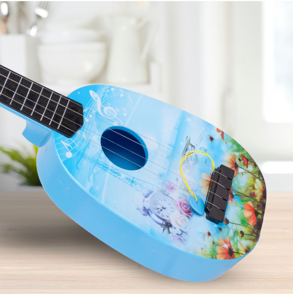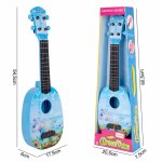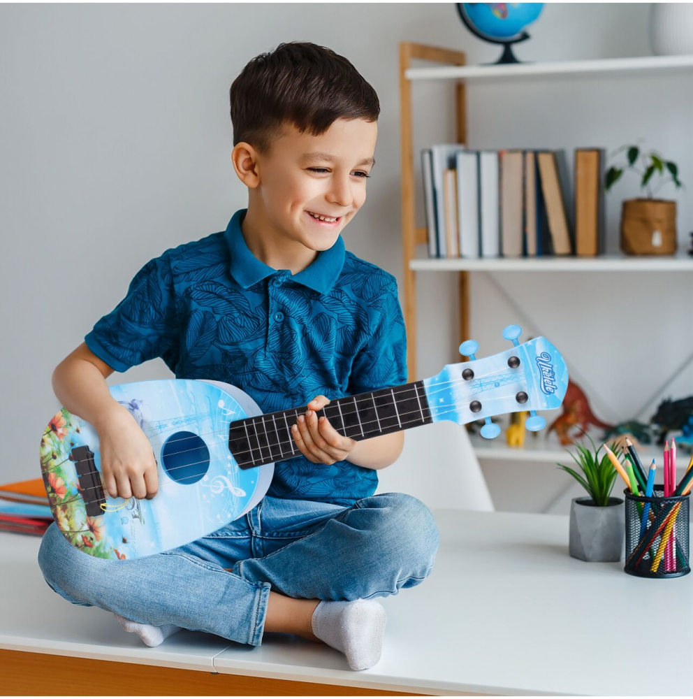 Chitara pentru copii Malplay, design robust cu 4 corzi si plectru in forma de inima inclus, dimensiune 54.5 x 17.5 x 6 cm, Blue