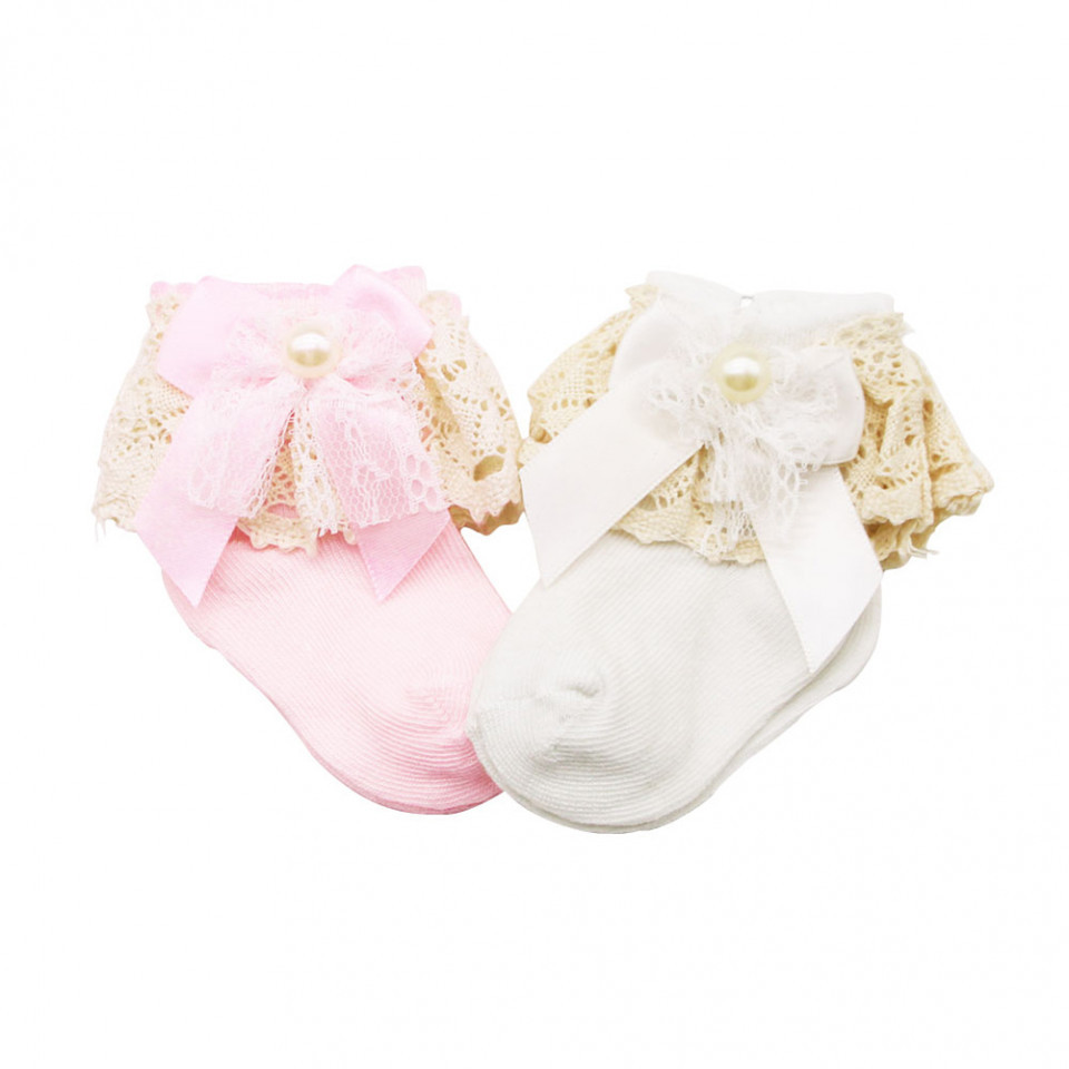 Ciorapei din bumbac cu dantela in partea superioala. Deasupra dantelei au o fundita din satin si din dantela accesorizata cu o perluta pentru un plus de eleganta.