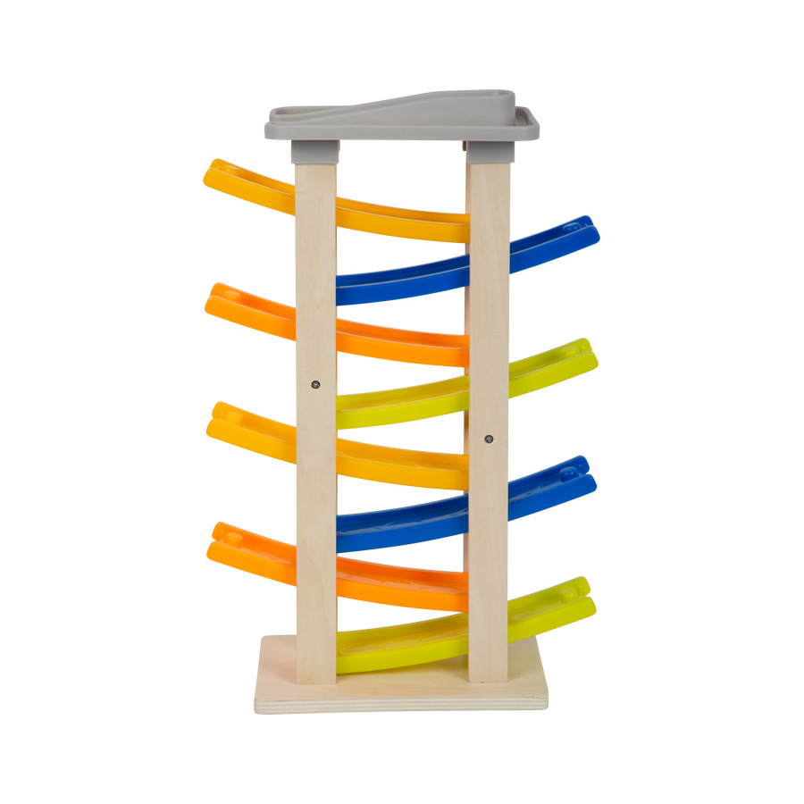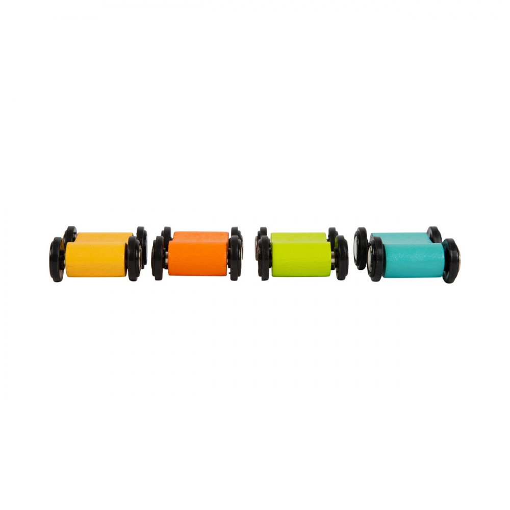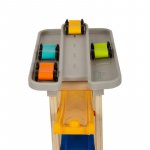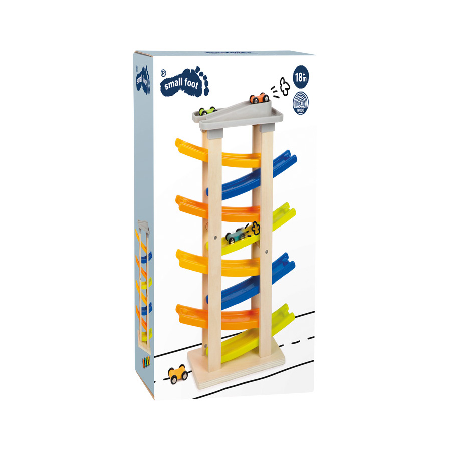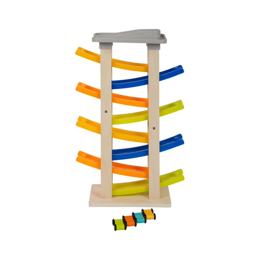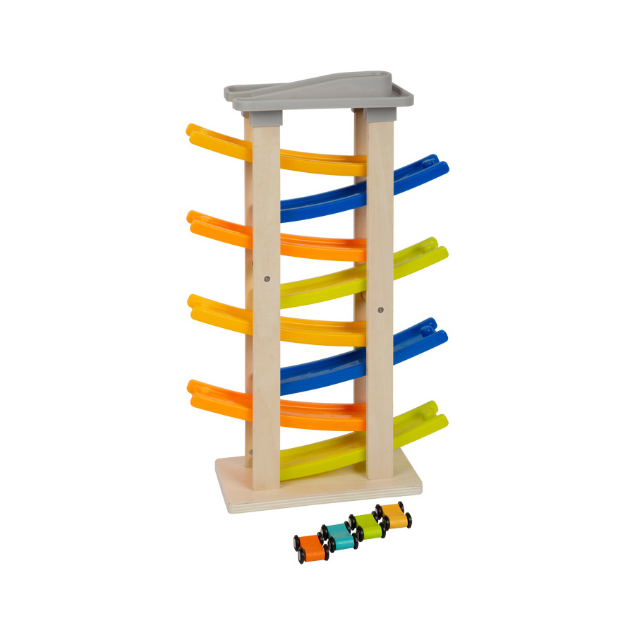 Cele patru mașinuțe de curse se avântă pe pista înaltă cu un clic-clac vioi, construită din lemn natural și dotată cu rampe robuste din plastic.