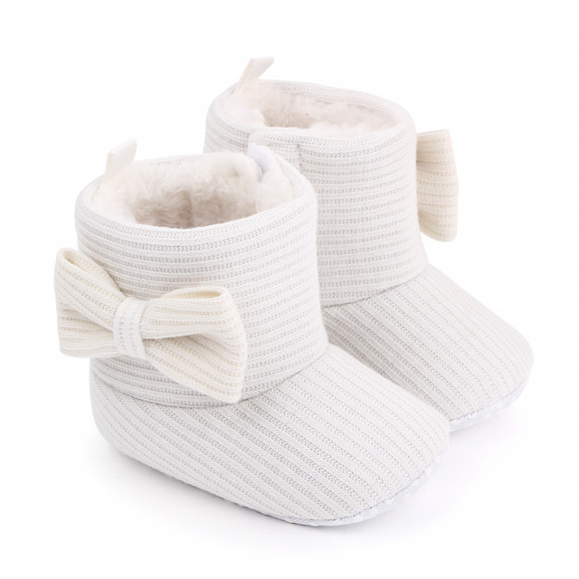 Cizmulite pentru fetite imblanite, din material textil, cu o fundita aplicata intr-o parte. Se inchid cu arici intr-o parte facilitand incaltarea cu usurinta.