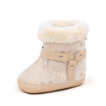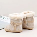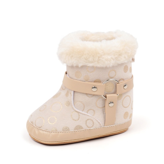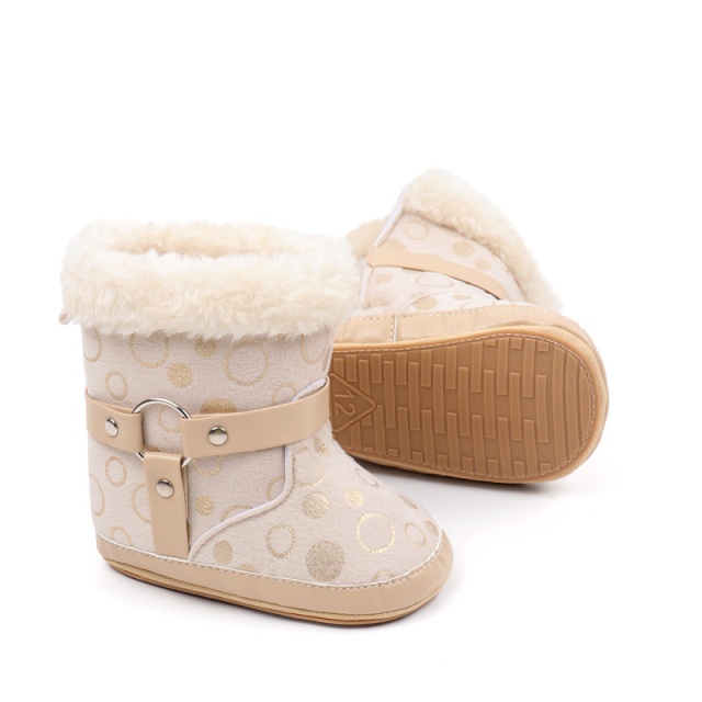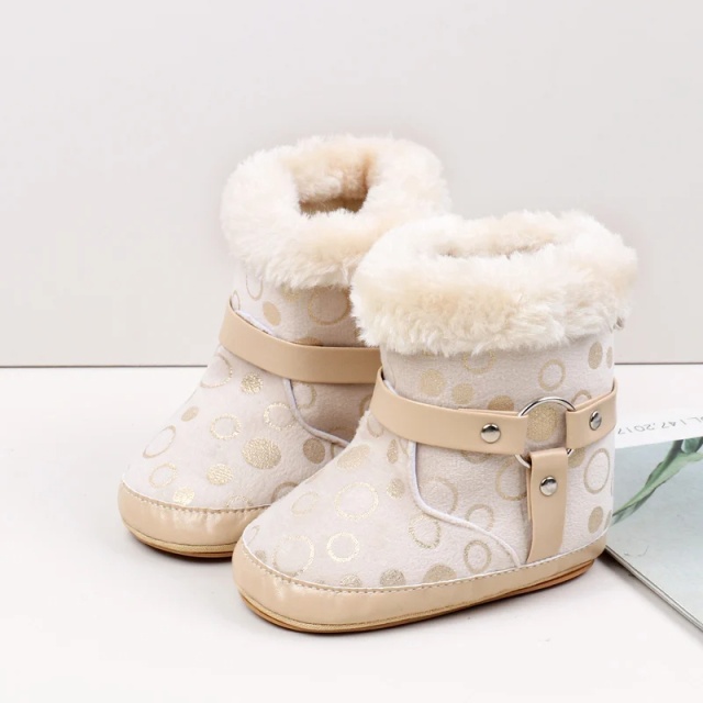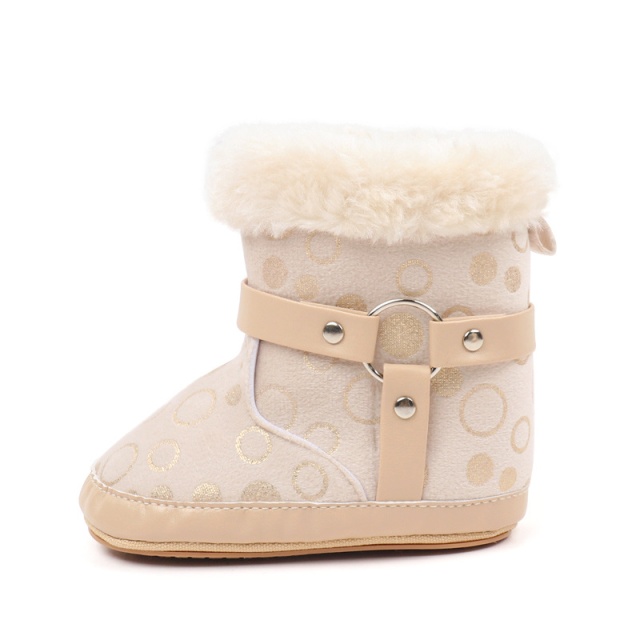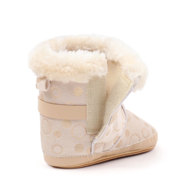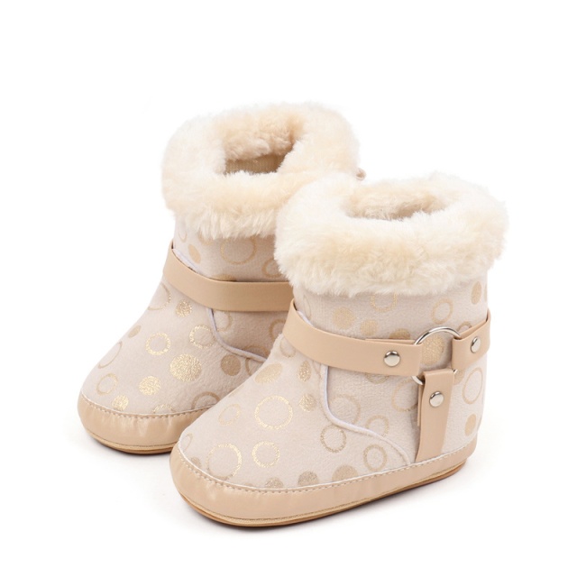 Cizmulite elegante pentru bebelusi, in nuanta crem, decorate cu buline aurii si blanita pufoasa pe margini.