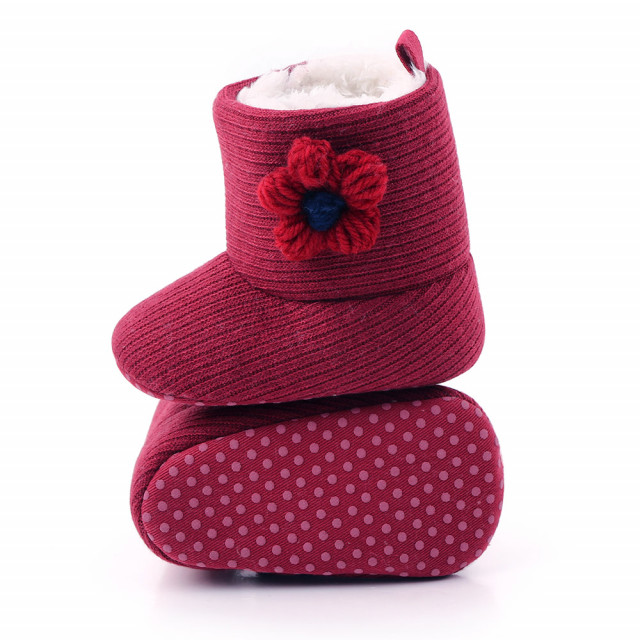 Cizmulite pentru fetite imblanite, din material textil, cu o floricica crosetata aplicata intr-o parte. Se inchid cu arici intr-o parte facilitand incaltarea cu usurinta.
