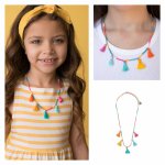 Un colier vibrant cu margele multicolore are accente de ciucuri pufosi in nuante stralucitoare.