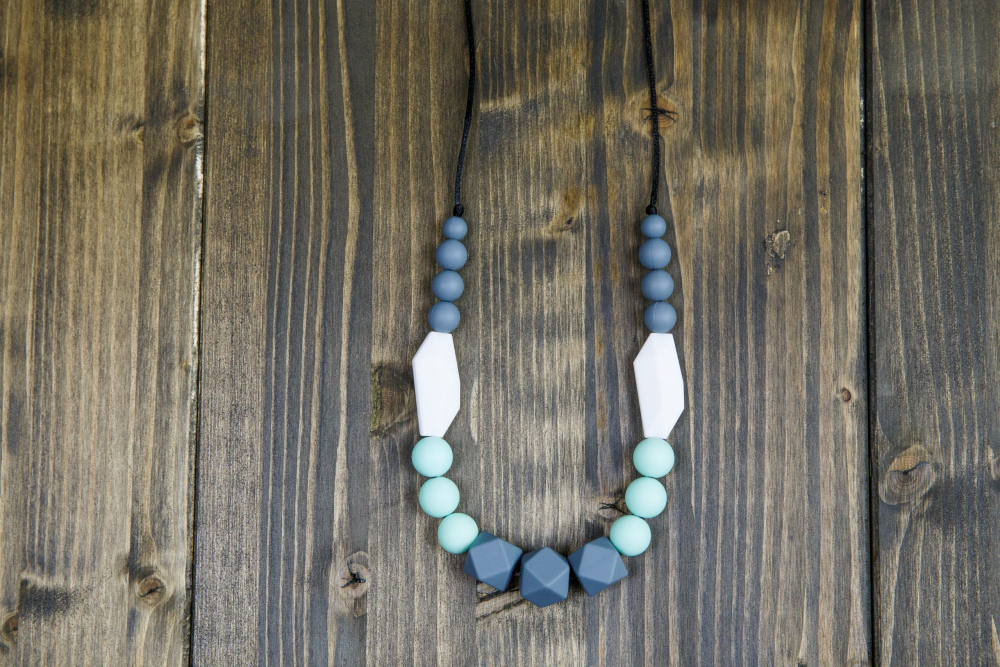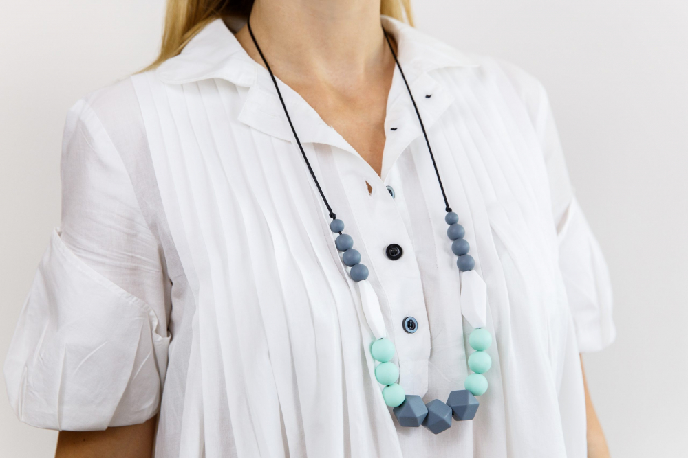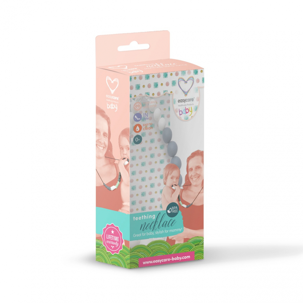 Colier dentitie din silicon alimentar non-toxic, fara BPA, ce poate fi purtat de mamici si rontait in siguranta de bebelusi. Acesta este potrivit oricarei tinute, putand fi purtat atat afara, in parca sau in vizite, cat si in interiorul casei, captand atentia copilului dvs.