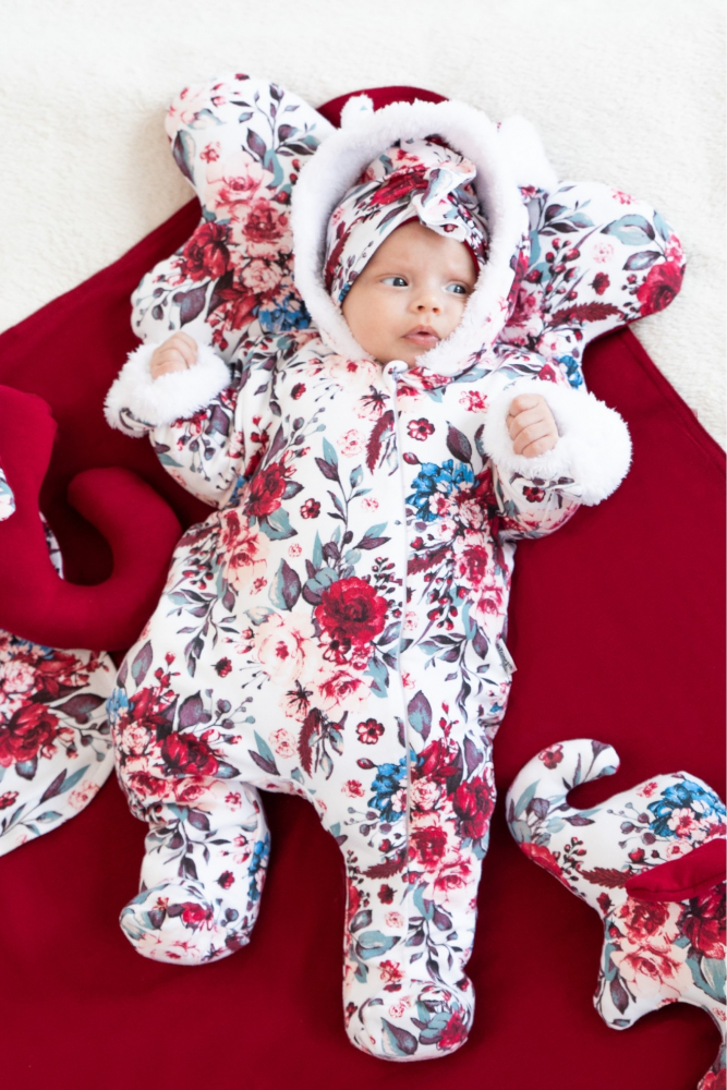 Combinezon realizat din bumbac alb cu imprimeuri florale si cusaturi albe, captusit cu poliester, ceea ce il face perfect pentru zilele reci.