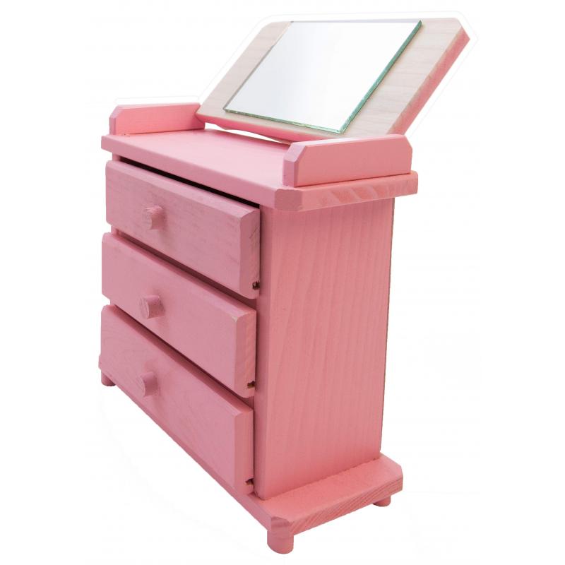 Mobilier pentru papusi confectionat din lemn de brad cu trei sertare si oglinda.