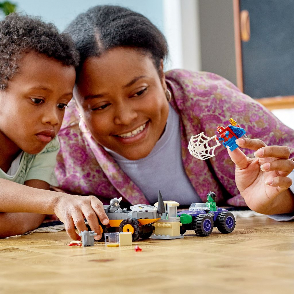 - Hulk vs. Rhino Confruntarea cu camioane (10782) contine 2 vehicule LEGO, 3 minifigurine, un jet pack Spider-Man si un seif bancar.