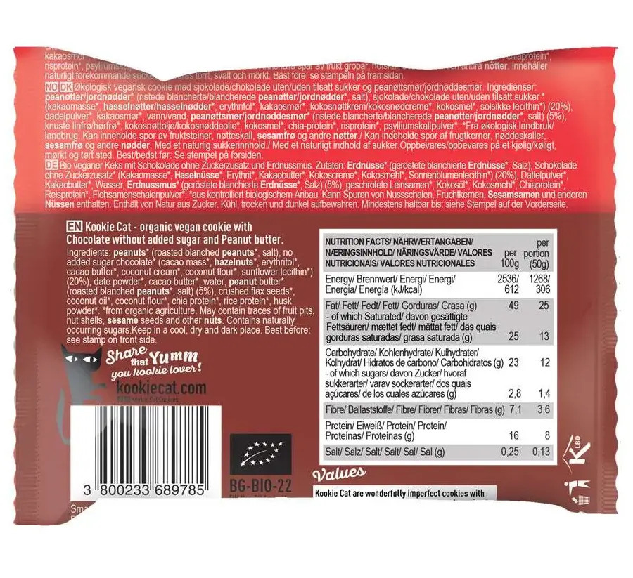 Ingrediente: ARAHIDE* (ARAHIDE prajite*, sare), ciocolata fara zahar adaugat* (masa de cacao*, ALUNE de padure*, erythritol*, unt de cacao*, crema de cocos*, faina de cocos*, lecitina de floarea soarelui*), pudra de curmale*, unt de cacao*, apa, unt de ARAHIDE* (ARAHIDE prajite*, sare), seminte de in pisate*, ulei de cocos*, faina de cocos*, proteina de chia*, proteina de orez*, tarate de psyllium*.