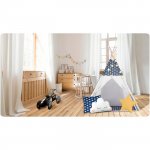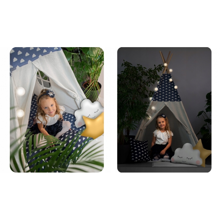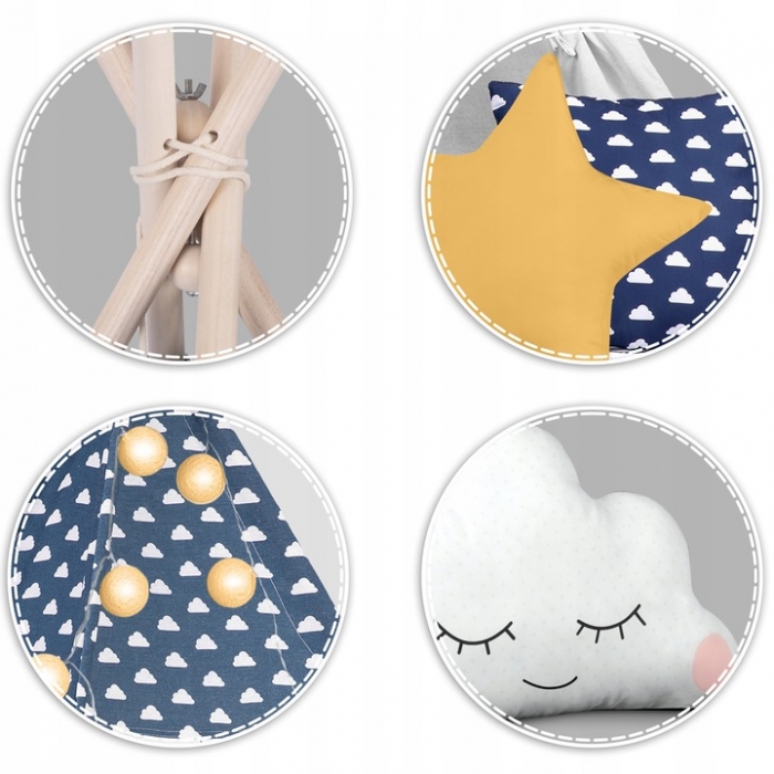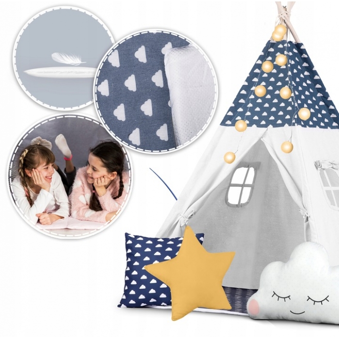 Cort de joaca pentru copii Montessori Nukido Tipi Bleumarin 120x120x165cm cadru din lemn,cu 3 pernute din bumbac, covoras si ghirlanda lumini incluse