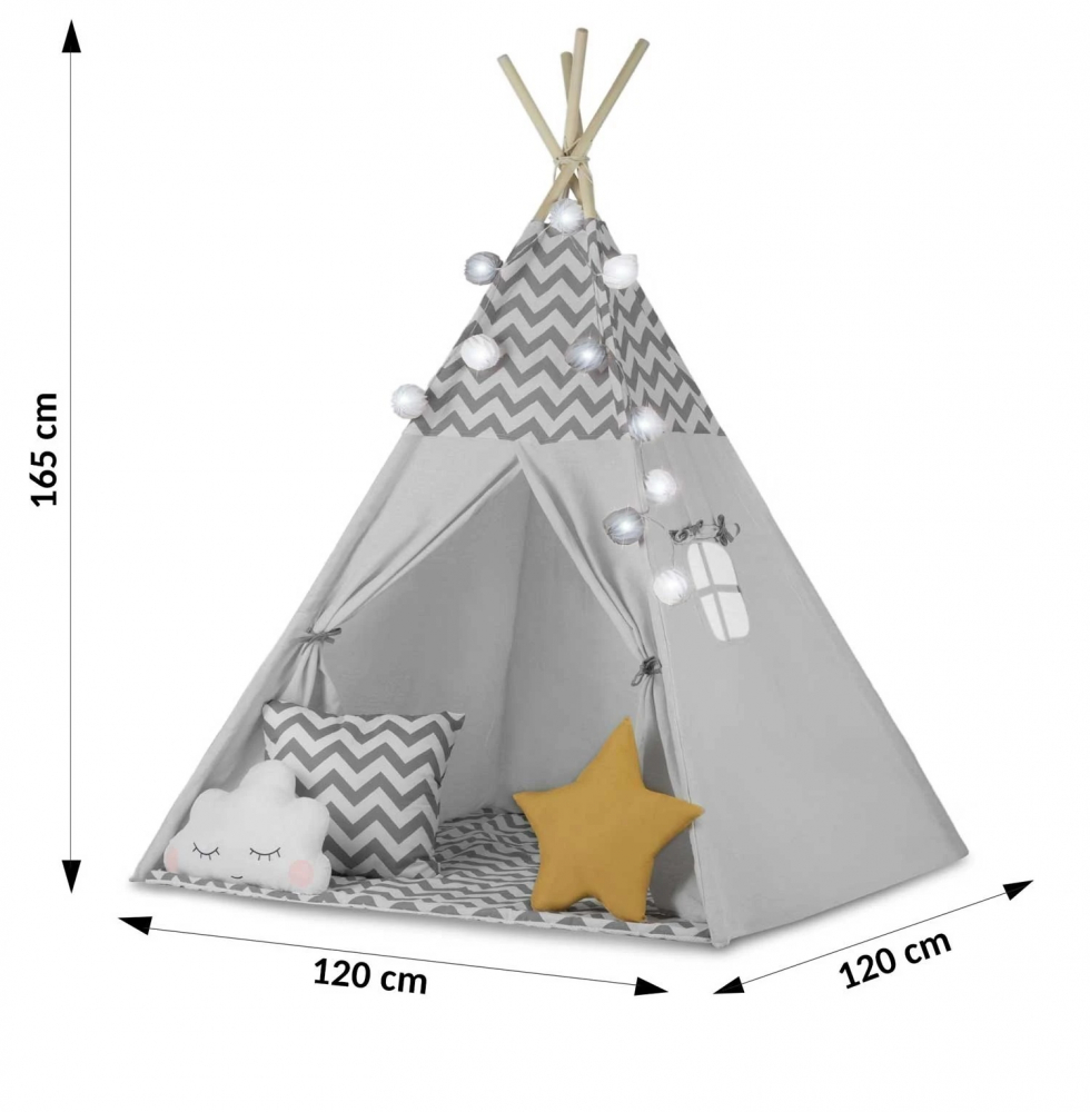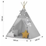 Cort de joaca pentru copii Montessori Nukido Tipi Gri 120x120x160cm cu 3 pernute din bumbac, covoras si ghirlanda lumini incluse