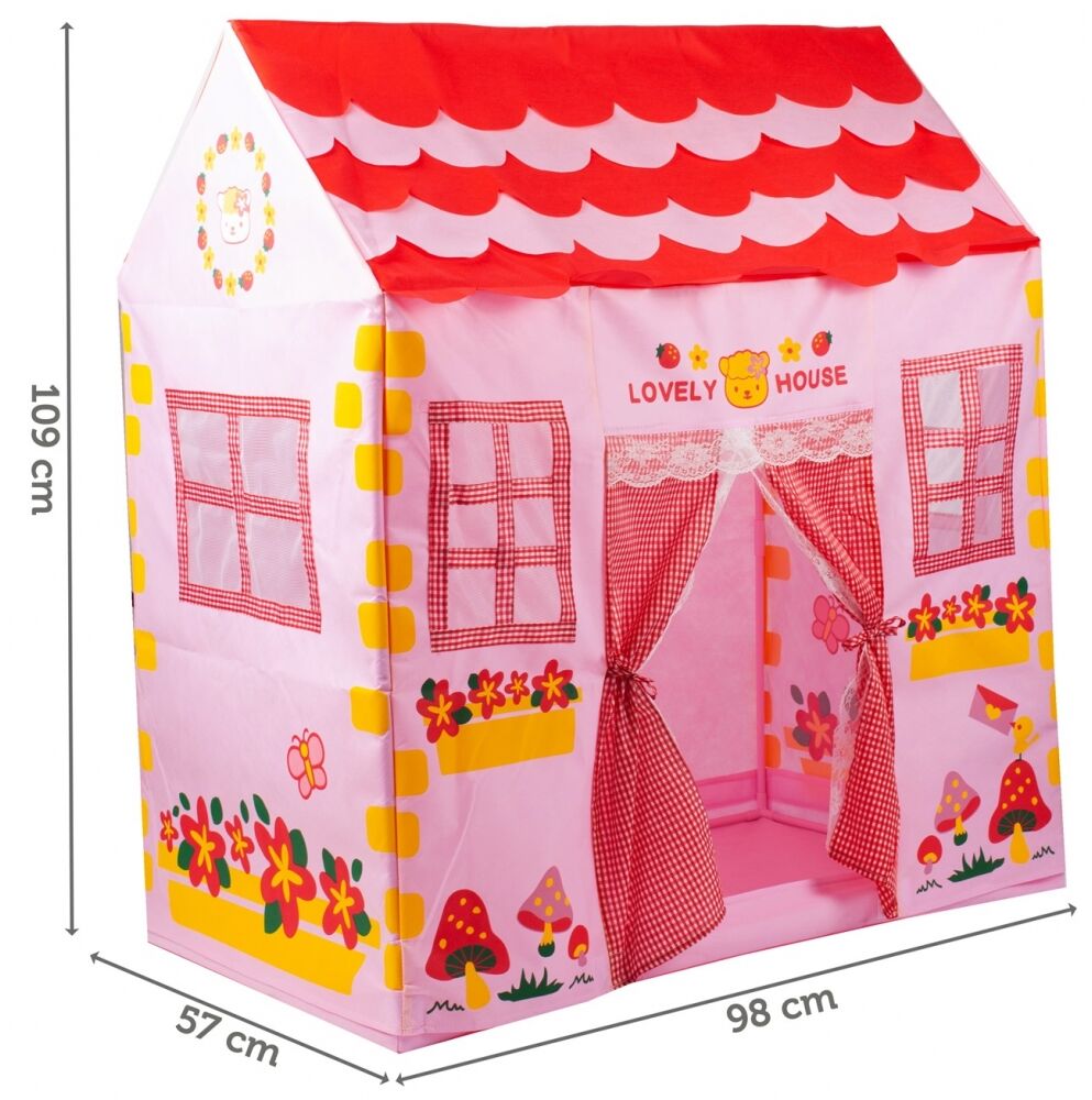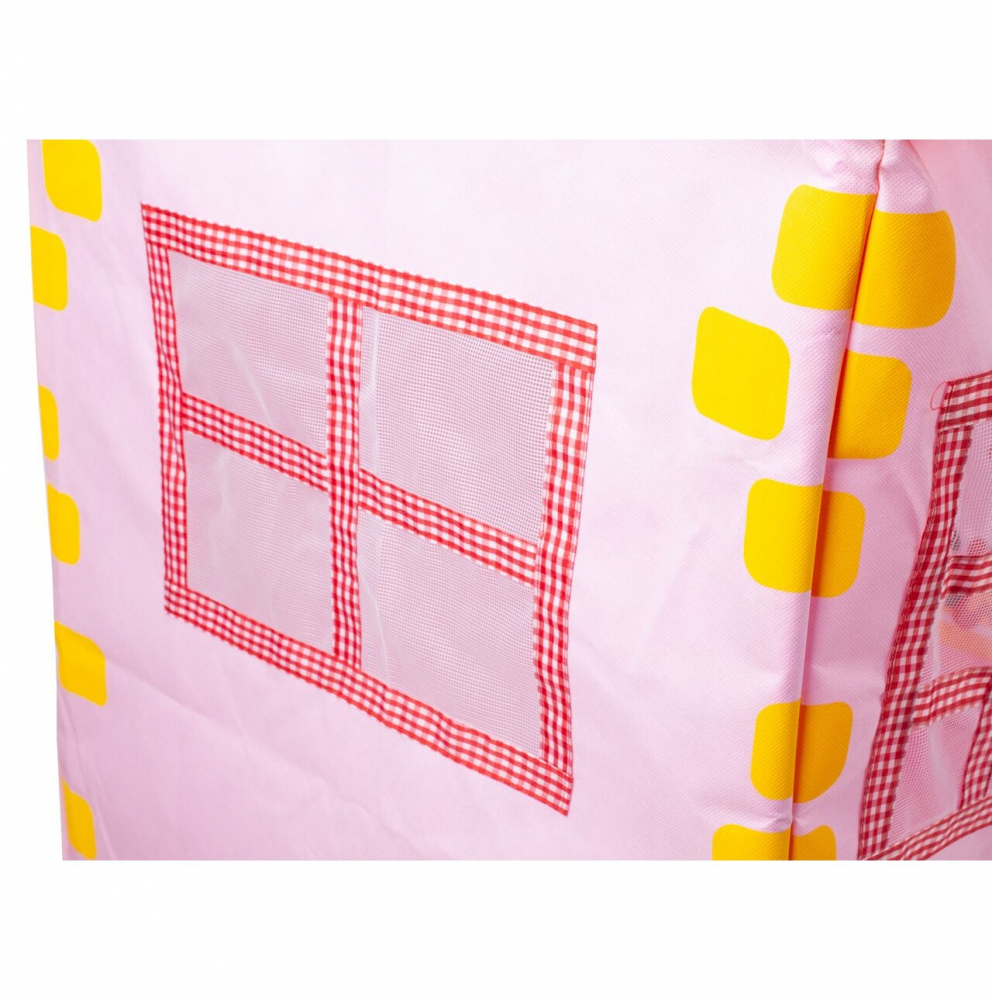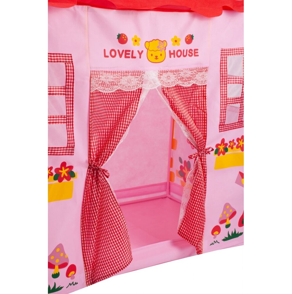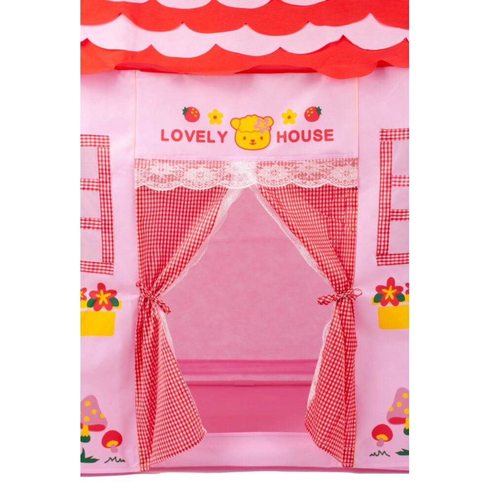Cortul are forma unei case fermecatoare, roz si are ferestre tip plasa imprimate si finisate si o intrare care se deschide si se leaga pe laterale cu o fundita.