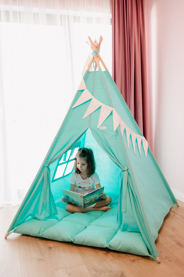 Cortul teepee reprezinta locul perfect de joaca, refugiu, odihna, citit, un spatiu personal unde copilul isi poate creea propria lume.
