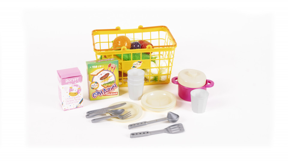 - Setul contine: cos, 12 fructe si legume, 10 oua, sandwich, iaurt, 4 pahare, 4 farfurii, cratita mare cu capac, furculita, lingura, cutit, polonic, lopatica.