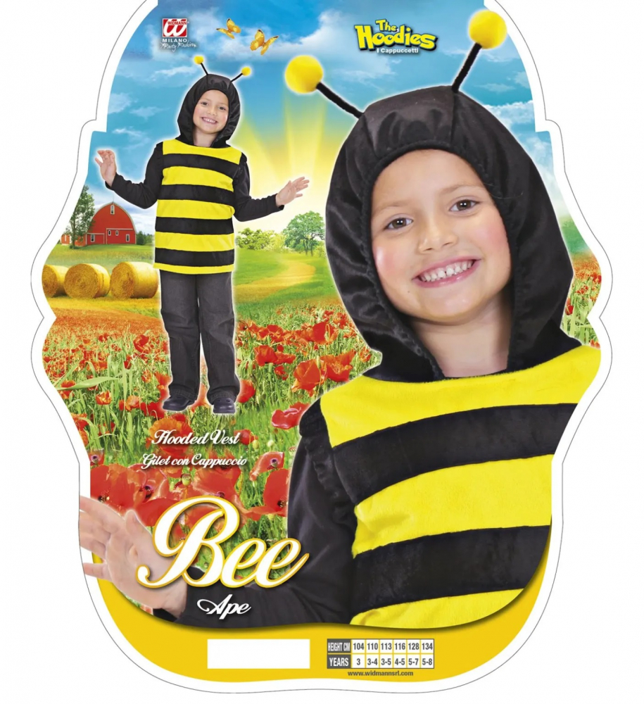 Costum Albina Vesta contine vesta neagra cu dungi galbene si gluga cu antene aplicate.
