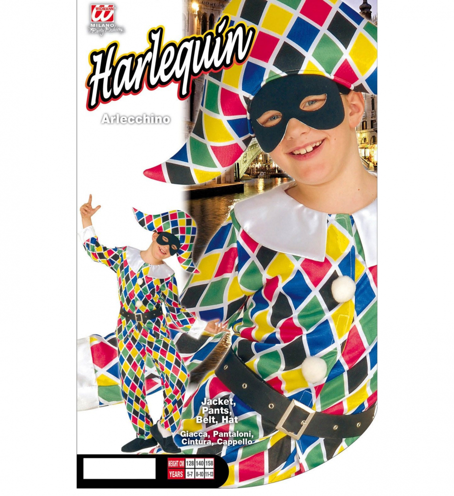 Costumul de arlechin include jacheta, pantalonii, cureaua si palaria specifica.