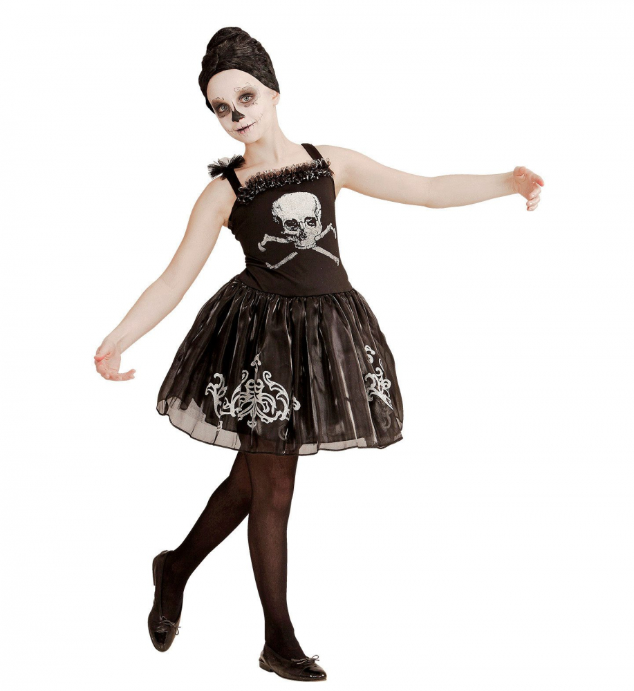 Costum Balerina Schelet Fetita include rochia cu imprimeu schelet in zona pieptului si detalii argintii din glitter aplicate pe fusta.